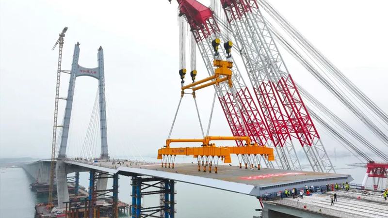 3月30日上午10時(shí)02分 隨著最后一塊鋼箱梁成功吊裝到位 陽(yáng)江港大橋順利合龍 如一條巨龍橫臥海面 標(biāo)志著廣東省濱海公路 海陵大堤段至溪頭段實(shí)現(xiàn)全線貫通 向通車目標(biāo)邁出了重要一步! 陽(yáng)江港大橋全長(zhǎng)4777.2米 是廣東濱海旅游公路陽(yáng)江海陵大堤 至溪頭段公路項(xiàng)目的控制性工程 由保利長(zhǎng)大工程有限公司承建 巨力索具負(fù)責(zé)該項(xiàng)目鋼箱梁吊具制作 鋼箱梁采用大節(jié)段吊裝方案,分6個(gè)節(jié)段 最大梁段長(zhǎng)90米,最小梁段長(zhǎng)74.5米