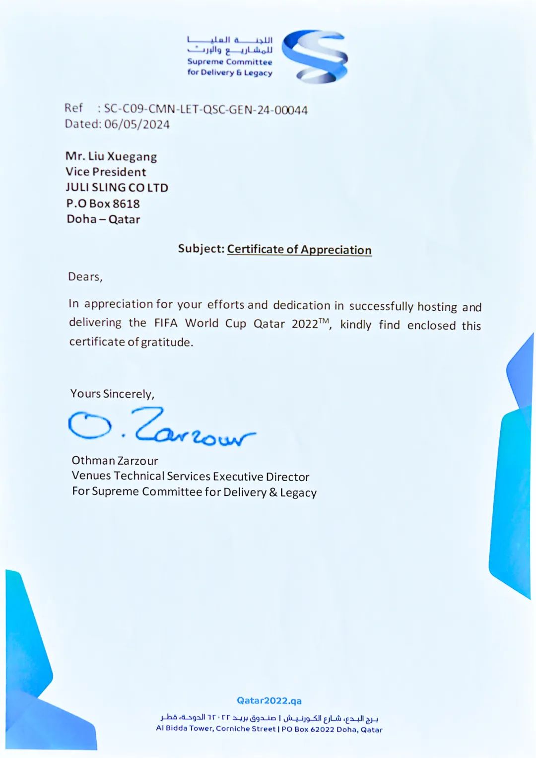 隨著2024年溫暖的春意,我們收到了來自項目業(yè)主——卡塔爾交付和遺產最高委員會(SUPREME COMMITTEE FOR DELIVERY & LEGACY)的感謝信及認可證書,這是對我們過往努力的最佳肯定。信中的每一個字句,都是對我們團隊辛勤工作和不懈努力的高度認可。這份榮耀不僅屬于我們,也屬于每一位支持和關注我們項目的人。您們的信任和支持是我們最寶貴的財富,是我們不斷前進的動力源泉。