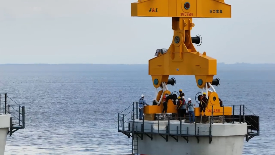 巨力索具生產制造的預制箱梁吊具與中鐵大橋局研制的“天一號”運架一體船協同作戰,采用“低平潮取梁、漲潮期運輸、平潮期落梁”的精準調度方案,克服了海域潮汐變化大、海上風浪干擾強、運輸距離長等諸多施工難題,將落梁誤差控制在毫米級,最終將這新一代“世界梁王”架設到位。