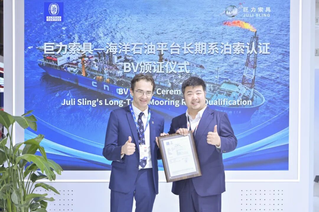 12月2日,2025中國國際海事會展(MARINTEC CHINA 2025)盛大開幕。開展首日,全球領先的檢驗認證機構法國船級社(Bureau Veritas,簡稱BV)為巨力索具舉行“海洋石油平臺長期系泊索”專項認證證書頒證儀式,巨力索具總裁楊超親臨現場,代表公司接受了這份象征國際高標準認可的重要證書。