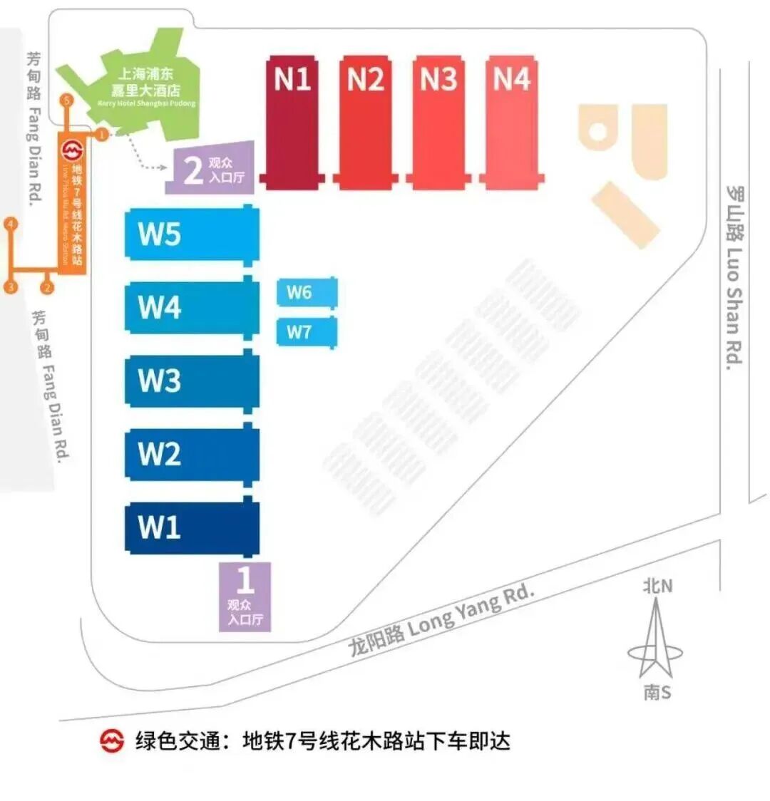 地鐵7號線:乘坐7號線至花木路站,從1號、2號或5號出口出站,步行約2-3分鐘可直達展館2號入口廳。