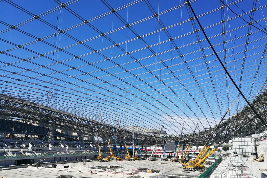 盧塞爾體育場是2022卡塔爾世界杯主體育場,最多可容納92000人。該體育場外形以阿拉伯椰棗碗和琺瑯燈籠為設計靈感,屋頂為雙曲面構造,造型呈馬鞍形,東西高,南北低,整個體育場投影為圓形。屋面主索網采用魚腹式索網結構,跨度達到274米,最大懸挑距離為76米,該結構形式為首次應用,無論是對產品的制造,還是施工安裝都具有極大的挑戰。因此盧賽爾體育場也成為了全球最大跨度雙層交叉索網屋面單體結構。同時也是設計標準最高的索網屋面單體建筑。整個索網結構從產品原材料到成品制造以及施工安裝均超過了歐美標準要求,巨力索具憑借過硬的實力成為一級專業分包,負責執行整個屋頂索膜結構體系的設計、供貨、安裝總承包工作。
